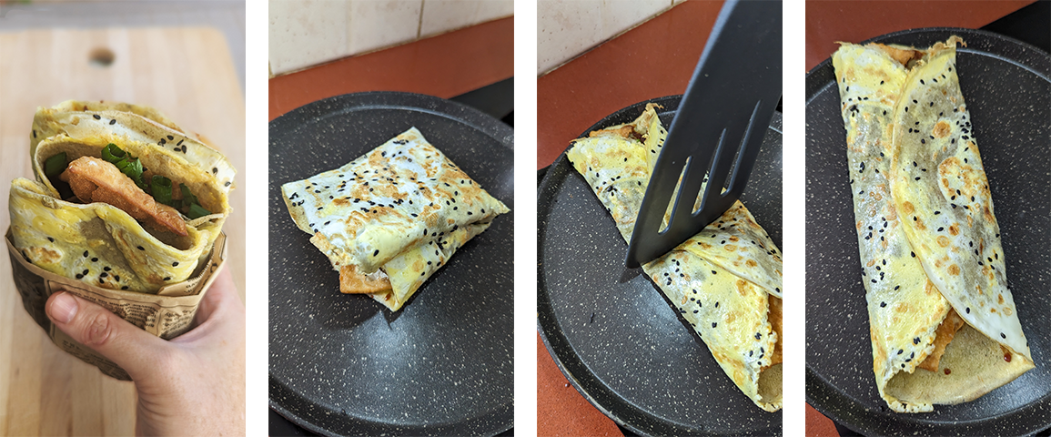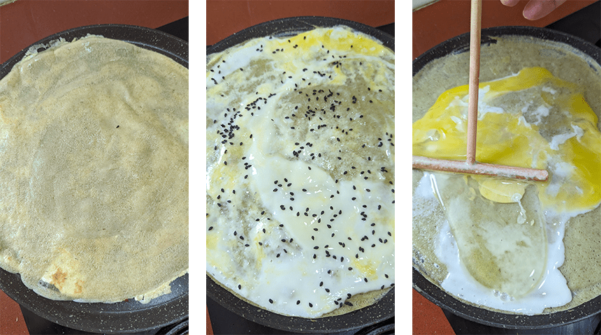 מפזרים מעט שומשום שחור על פני הביצה, ממתינים כדקה עד שהביצה כמעט מוכנה והופכים את הקרפ כשצד הביצה כלפי מטה.