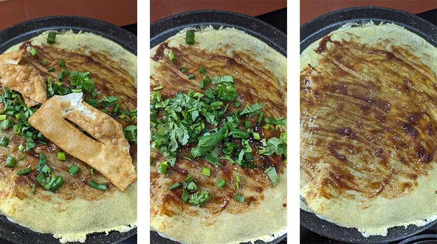 מכינים את הג'יאן בינג – מחממים מחבת נון-סטיק על אש בינונית-גבוהה. מוזגים בערך ¾ כוס מהבלילה למחבת ומשטחים באופן אחיד על גבי המחבת. ממתינים כדקה עד שלא נותרים חלקים רטובים על פני הבלילה והתחתית משחימה קלות, שוברים ביצה על גבי הקרפ ומורחים אותה בצורה אחידה כך שתכסה את כולו.