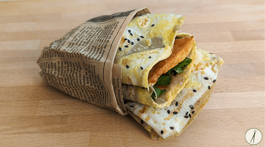 ג'יאן בינג – Jiānbing. אוכל רחוב שניתן למצוא בכל רחבי סין ונאכל בדרך כלל לארוחת בוקר. זהו קרפ העשוי לרוב מתערובת של קמח מש וקמח רגיל ומגיע עם תוספת של ביצה, רוטב מתקתק, ירקות ובצק מטוגן כלשהו כמו יו-טייאו (סוג של סופגניה סינית מלוחה) או באו צוויי שהם עלי בצק דקים מטוגנים ופריכים. בחלק מהאזורים בסין מוסיפים גם סוגי בשר שונים ורוטב צ'ילי. הקרפ הרך בשילוב עם התוספות יוצר שילוב מרקמים וטעמים נהדר שפשוט כיף לאכול. לצורך הכנת הקרפ משתמשים בשעועית מש יבשה, שימו לב שיש צורך להשרות את השעועית במים למשך הלילה. במתכון הזה אני מביאה את הגרסה הבסיסית שעושה שימוש בבאו צוויי, הרגישו חופשי להחליף את הבאו צויי ביו טייאו, להוסיף רוטב צ'ילי ולהוסיף ירקות שונים כגון עלי חסה.