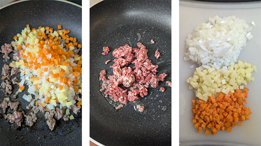 מכינים מילוי – חותכים בצל, גזר ותפו"א לקוביות קטנות. מחממים מעט שמן במחבת גדולה על אש גבוהה, מוסיפים בשר ומטגנים תוך כדי ערבוב עד שהוא משנה את צבעו. מוסיפים ירקות ומטגנים מספר דקות עד שהם מתרככים.