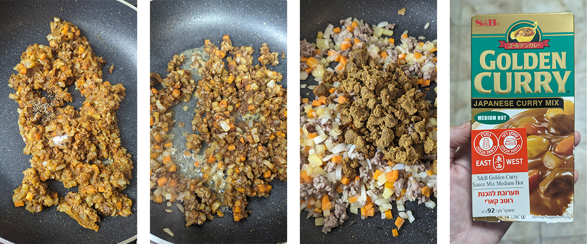 מוסיפים קוביות קארי יפני ואת המים ומערבבים להמסת הקארי. אם התערובת יבשה מוסיפים קצת מים. מתבלים במלח ופלפל לפי הטעם ומניחים לצינון.