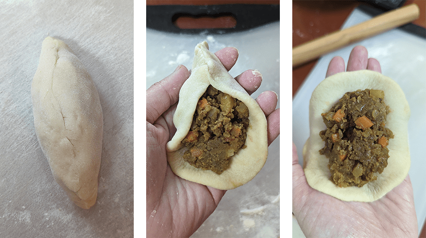 מכינים את הקארה פאן – מחלקים את הבצק ל-8 חלקים שווים, מכדררים כל חלק ומניחים מכוסה ל-15 דקות. מחלקים את המילוי ל-8 חלקים. מרדדים כל כדור לעובי חצי ס"מ, מניחים מהמילוי במרכז הבצק וסוגרים לצורה אליפטית מוארכת.