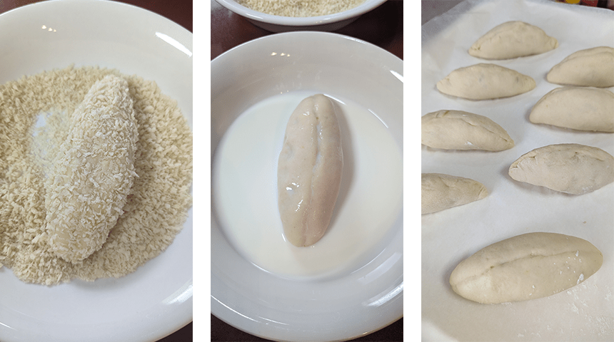 שמים חלב בצלחת עמוקה ופירורי פנקו בצלחת נוספת.