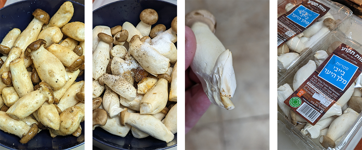 מכינים את הפטריות – מסירים מעט מבסיס הפטריות, שוטפים היטב ומניחים בקערה. מוסיפים פלפל שחור טחון, מלח, 1 כף סוכר ורוטב סויה. מערבבים היטב ומניחים ל-15 דקות לספיגת טעמים.