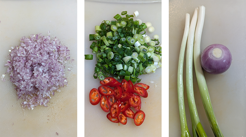 מכינים את הירקות – קוצצים דק מאוד את הבצל הסגול, אפשר במעבד מזון ומניחים בצד. חותכים את הצ'ילי ואת הבצל הירוק לפרוסות דקות.