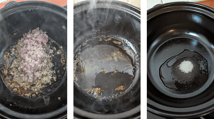 מכינים את המנה – בסיר קטן (רצוי סיר חרס) מחממים שמן על להבה בינונית-גבוהה. מוסיפים 1 כף סוכר ומערבבים עד שהסוכר נמס ומשחים מעט. מוסיפים את הבצל הסגול הקצוץ ומטגנים כחצי דקה לריכוך.