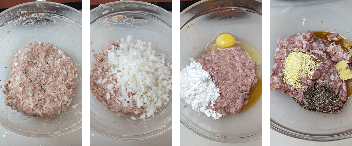 מכינים את הקציצות – קוצצים דק בצל ומגרדים ג'ינג'ר על פומפיה דקה. מניחים בשר טחון בקערה. מוסיפים ג'ינג'ר מגורד, אבקת מרק עוף, מירין, סויה, מלח ופלפל שחור. מערבבים ומוסיפים ביצה, שמן שומשום וקמח תפו"א. מערבבים היטב, מוסיפים את הבצל הקצוץ ולשים את התערובת עד לקבלת עיסה אחידה ודביקה.