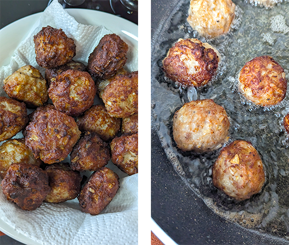 מחממים שמן לטיגון חצי עמוק במחבת רחבה. יוצרים כדורים בקוטר 3 ס"מ מתערובת הבשר, מכניסים לשמן החם ומטגנים עד להשחמה מכל הצדדים. מוציאים לצלחת מרופדת בנייר סופג ומניחים בצד.