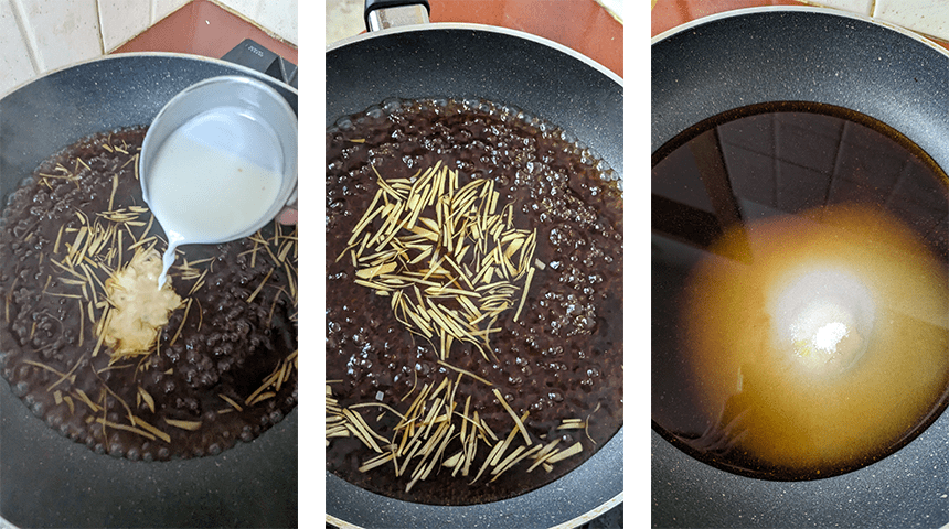מכינים את הרוטב – חותכים ג'ינג'ר לגפרורים דקיקים ומניחים בצד. מחממים מחבת נקייה על אש בינונית-גבוהה ומוסיפים מים, סוכר, רוטב סויה וחומץ אורז ומערבבים היטב. מבשלים עד שהסוכר נמס, מוסיפים את גפרורי הג'ינג'ר ומבשלים כדקה. מזלפים את תערובת קמח תפוחי האדמה והמים ומערבבים עד שהרוטב מסמיך.