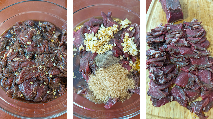 מכינים את הבשר – חותכים נתח שייטל לרצועות אורכיות (עם כיוון הסיבים) בעובי של כ-5 ס"מ, פורסים כל רצועה לפרוסות דקות (נגד כיוון הסיבים) ומניחים בקערה. קוצצים גס שום ומוסיפים לקערה עם הבשר יחד עם רוטב סויה, מיץ לימון, חומץ, סוכר חום ופלפל שחור טחון. מערבבים היטב, מכסים בניילון נצמד ומכניסים למקרר למשך שעה לפחות, אפשר גם למשך הלילה.