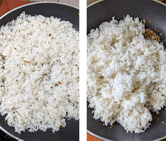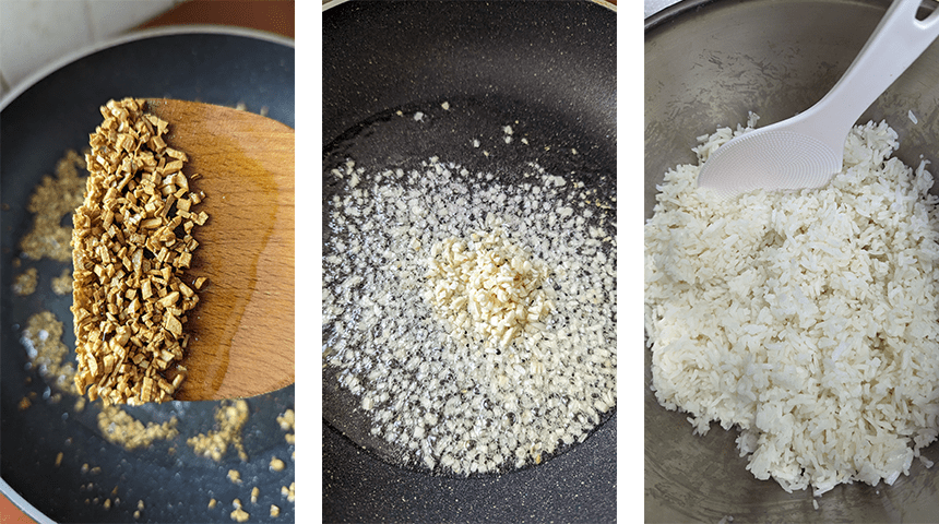 בינתיים מכינים את האורז – קוצצים גס שום. מפוררים את הגושים שבאורז הקר ומתבלים במלח. מחממים מחבת רחבה ועמוקה על אש בינונית, מוסיפים את שיני השום ומטגנים באיטיות עד להשחמה, מוציאים כשתי כפות מהשום המטוגן לצלחת ושומרים בצד לקישוט האורז בזמן ההגשה.