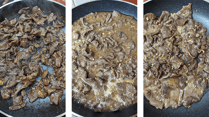 מכינים את הבשר – מחממים שתי כפות שמן במחבת על אש גבוהה, מוסיפים את הבשר עם נוזלי המשרה יחד עם המים הרותחים ומביאים לרתיחה. מנמיכים את האש לבינונית ומכסים את המחבת במכסה. מבשלים 40-60 דקות עד שהבשר רך, פותחים את המכסה, מגבירים את האש לגבוהה ומאדים את כל הנוזלים עד שהבשר שחום ומקורמל. מסירים מהאש.