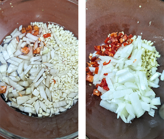 מכינים את המטבל – חותכים בצל לקוביות, קוצצים גס שום וצ'ילי ושמים בקערה. מוסיפים חומץ, רוטב סויה, סוכר ומלח ומערבבים להמסת הסוכר. טועמים ומתקנים תיבול, המטבל אמור להיות מאוזן מבחינת טעמי מלוח/חמוץ/מתוק.