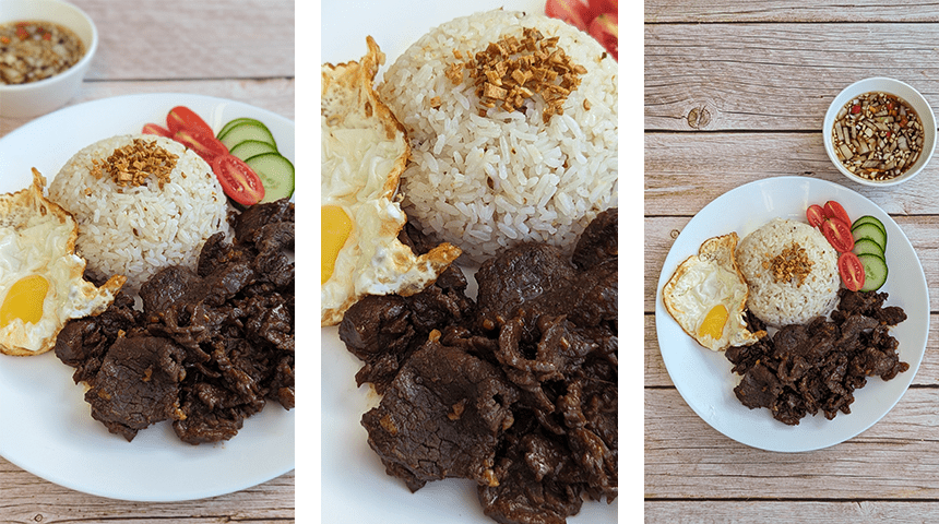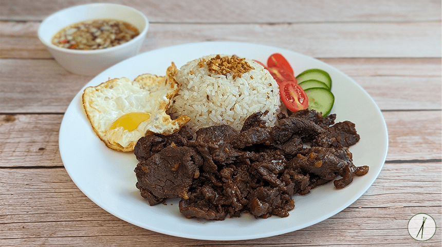 טאפסילוג – Tapsilog. ארוחת בוקר פיליפינית נפוצה המורכבת משלושה מרכיבים עיקריים אשר מהם נגזר שם המנה – בשר בקר (טאפה), אורז מטוגן עם שום (סינאנגאג) וביצה מטוגנת (איטלוג). ישנן מספר דרכים להכין את הבשר במנה כאשר הדרך המסורתית היא לייבש אותו (כמו ביף ג'רקי) ואח"כ לטגן אותו עם מרכיבי הרוטב, אני הכנתי את הדרך הנפוצה כיום שהיא לבשל את הבשר עד שהוא רך ואז לצמצם את הנוזלים עד שהוא שחום ומקורמל. לצד הארוחה נהוג להגיש מטבל על בסיס חומץ אשר נועד להקליל מעט את הכבדות של הבשר והאורז. אמנם ישנן הרבה הכנות אך כל מרכיב בארוחה מאוד פשוט להכנה בפני עצמו.