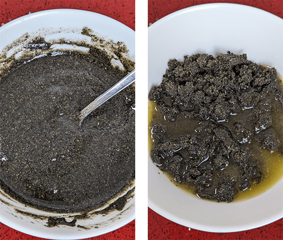 בקערה קטנה מערבבים דבש וחמאה מומסת, מוסיפים את תערובת השומשום ומערבבים לקבלת תערובת אחידה וחלקה ללא גושים, מכסים ומכניסים למקרר.