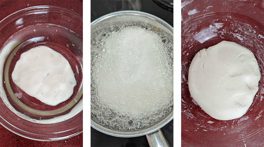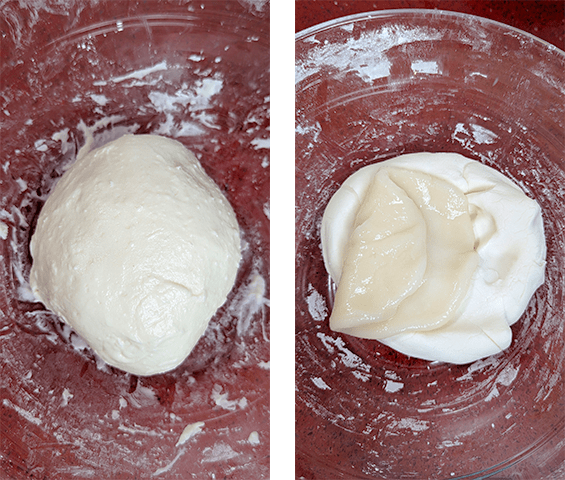 מעבירים את הבצק המבושל לקערה עם הבצק הרגיל ולשים יחד עד לקבלת בצק אחיד ואלסטי. עוטפים בניילון נצמד ומניחים ל-20 דקות.