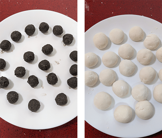 מחלקים את הבצק ל-10 חלקים שווים ומכדררים לכדורים. מוציאים את תערובת השומשום מהמקרר, מחלקים ל-10 חלקים שווים ומכדררים לכדורים, במזג אוויר חם מחזירים את כדורי השומשום למקרר להתמצקות.
