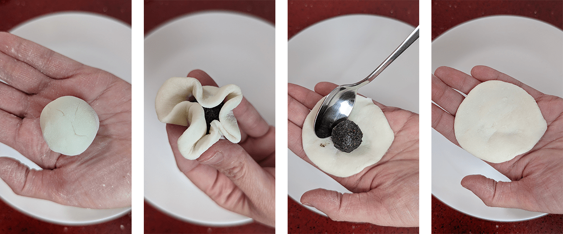 משטחים כדור בצק, מניחים במרכזו כדור שומשום בעזרת כפית על מנת שלא ללכלך את הידיים וסוגרים לכדור חלק, נזהרים שמעטפת הבצק לא תקרע.