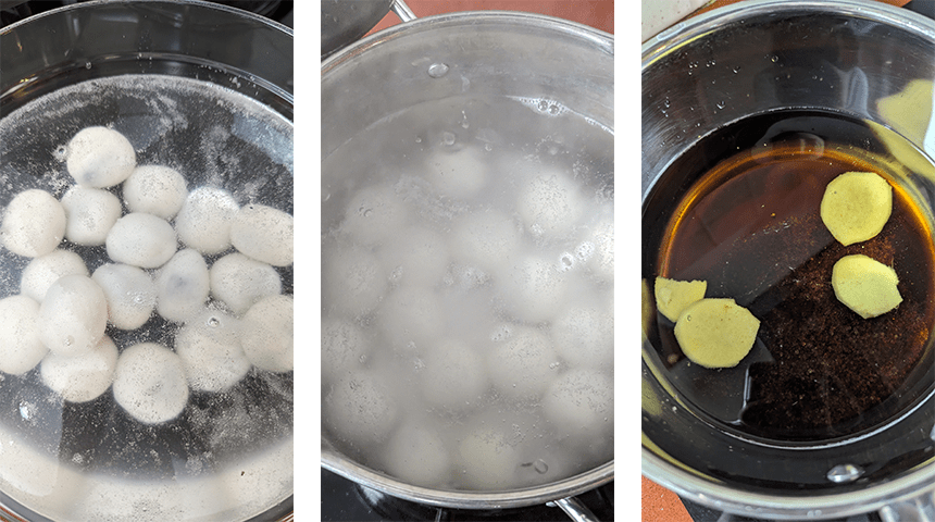 מבשלים את כדורי הטאנג יואן – מרתיחים מים בסיר, מכניסים את הכדורים הממולאים, ממתינים שהם יצופו ומבשלים במשך דקה נוספת, מוציאים לקערה מלאה במים קרים להפסקת הבישול.