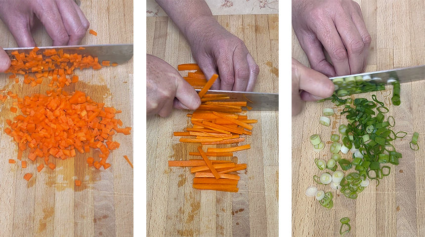 מכינים את הירקות – קוצצים בצל ירוק וחותכים גזר לקוביות קטנטנות.