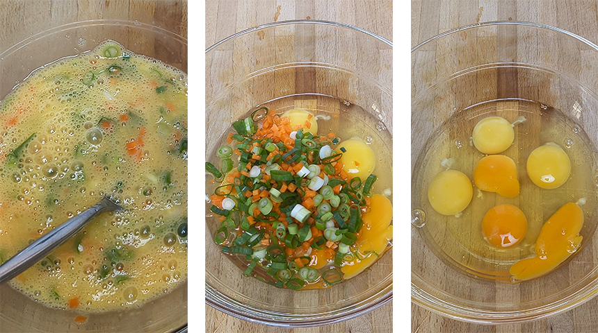 שוברים ביצים לקערה גדולה, מוסיפים בצל ירוק, גזר ומלח ומקשקשים עד שלא נשארים חלקים של חלבון לא מעורבב בתערובת.