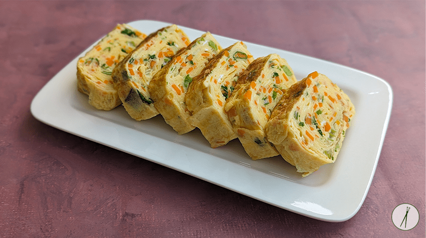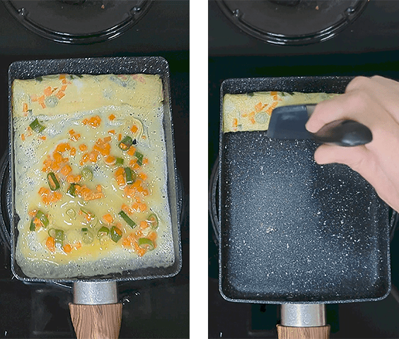 משמנים מעט את המחבת ומוזגים כרבע כוס מתערובת הביצים למחבת. מנענעים את המחבת כך שהתערובת מכסה בשכבה דקה ואחידה את תחתית המחבת, במידת הצורך מוסיפים מעט תערובת. ממתינים עד שהביצים מבושלות כמעט לגמרי (כ-80% מוכנות) ומגלגלים את יריעת הביצים והירקות שנוצרה בעזרת מרית.