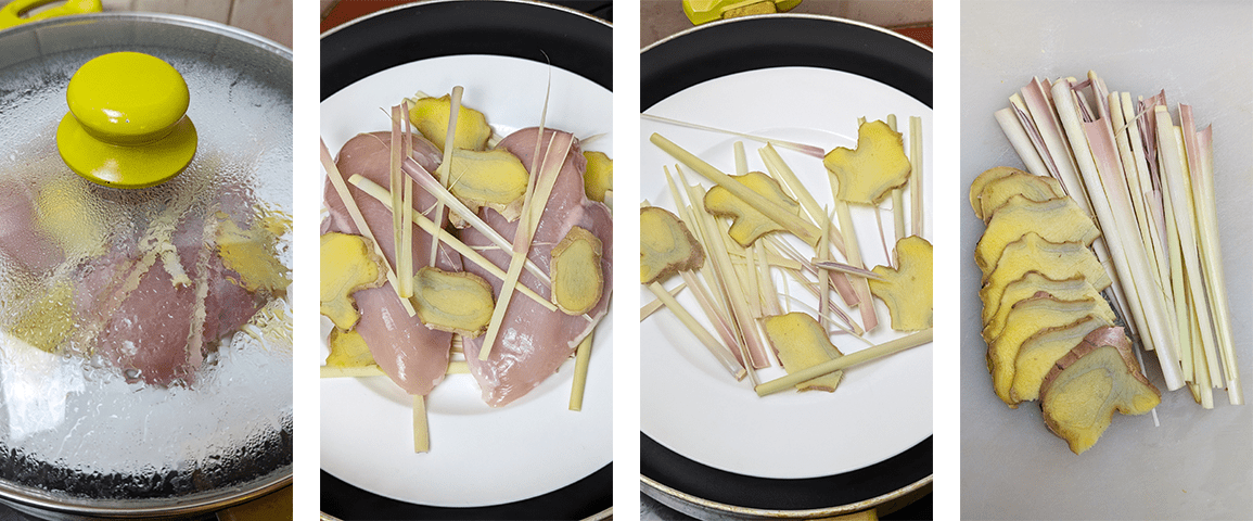 מכינים את העוף – פורסים ג'ינג'ר לפרוסות (לא צריך לקלף), חותכים למון גראס לרצועות לאורך, מסדרים על צלחת חצי מהלמון גראס והג'ינג'ר, מניחים מעל את העוף ומפזרים את החצי השני של הלמון גראס וג'ינג'ר על העוף. מכניסים לסיר אידוי או לסיר רגיל על הגבהה, מכסים ומאדים 17 דקות. מוציאים ומצננים קלות.