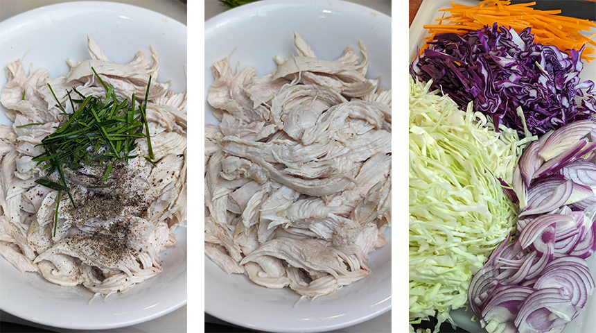 מכינים את הירקות – חותכים כרוב לבן וסגול, שאלוט וגזר לרצועות דקות ומעבירים לקערה גדולה.