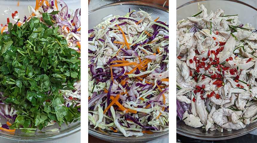 בעזרת האצבעות מפוררים את העוף לחתיכות בגודל נוח לאכילה, מוסיפים כף רוטב דגים ורבע כפית פלפל שחור. חותכים את עלי הקפיר ליים לרצועות דקיקות (הכי נוח בעזרת מספריים) ומוסיפים לעוף. מערבבים ומעבירים לקערה עם הירקות.