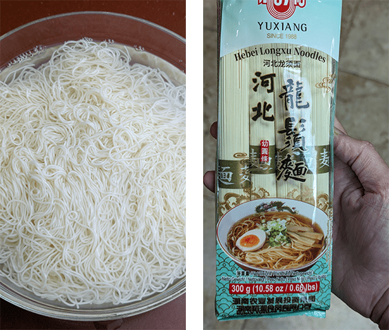 מבשלים את האטריות לפי ההוראות שעל האריזה ומסננים. שוטפים מתחת לזרם מים עד שהן מתקררות. מעבירים לקערה עם מי קרח, משפשפים את האטריות בין כפות הידיים בתוך המים על מנת להיפטר מעמילן מיותר. מסננים ושוטפים שוב תחת זרם מים.