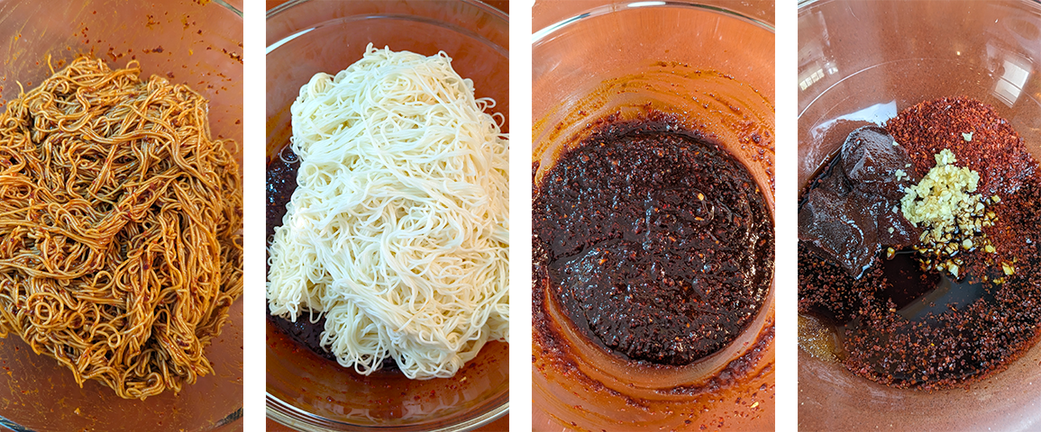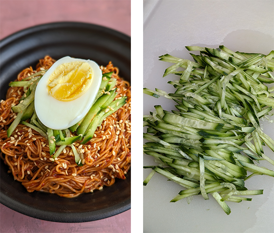 ביבים גוקסו – Bibim-guksu. מנה קוריאנית מסורתית קרה של אטריות סומן (אטריות חיטה דקיקות) מתובלות ברוטב פיקנטי המבוסס על מחית גוצ'וג'אנג (מחית פלפלים חריפים קוריאנית). על האטריות נהוג להניח ביצה, לרוב ביצה קשה וירקות טריים כמו מלפפון ו/או גזר חתוכים לגפרורים דקים. המנה דיי חריפה, מתקתקה עם מעט חמיצות. אם רוצים להוריד מרמת החריפות אפשר להפחית מכמות הגוצ'וג'אנג וגוצ'וגארו שבמתכון. המרקם של האטריות הקרות יחד עם הירקות הטריים יוצר מנה מרעננת וקלילה, מושלמת לימי הקיץ החמים.