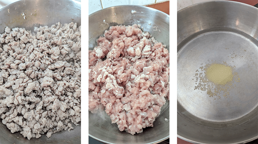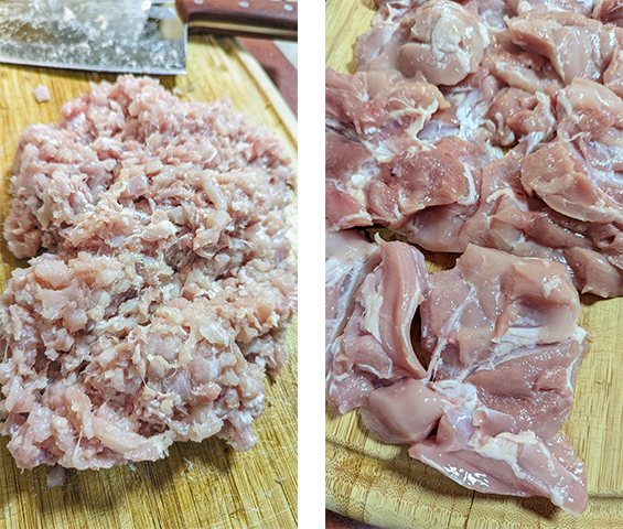 מכינים את העוף – קוצצים דק פרגיות בסכין חדה, החתיכות אמורות להיות מעט יותר גסות מאשר עוף טחון.