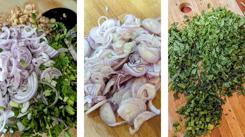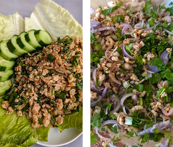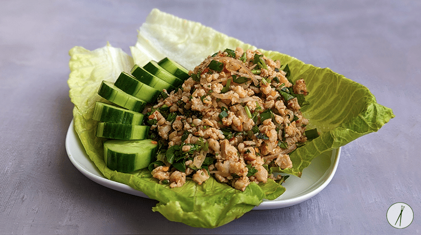 לאבּ גאי – Laab Gai (Larb Gai). אחת המנות האהובות והמוכרות מהמטבח התאילנדי המגיעה מאזור צפון-מזרח תאילנד (איסאן). סלט עוף קצוץ דק מתובל בנדיבות בעשבי תיבול ריחניים, ליים, רוטב דגים וצ'ילי חריף. מנה בעלת איזון מושלם בין חמצמצות, מליחות וחריפות המוגשת לרוב לצד עלים טריים כמו חסה או כרוב ומלווה באורז דביק. מנה מרעננת וקלילה שמאוד פשוט להכין.