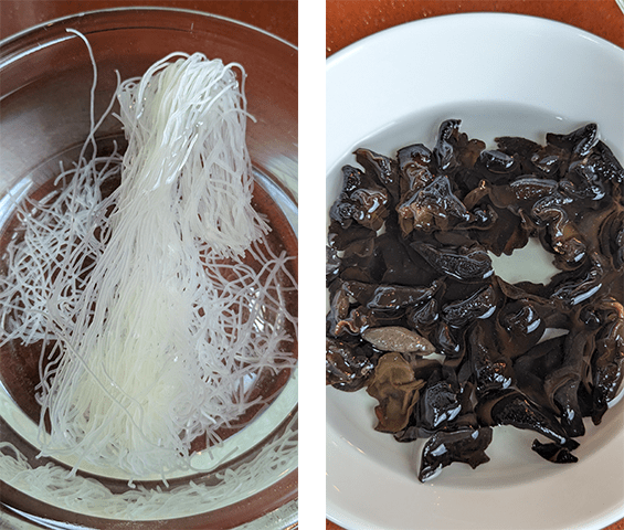 משרים פטריות שחורות ואטריות אורז במים חמימים 20-30 דקות או עד לריכוך.