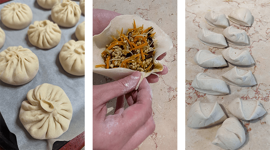 שמים כף גדושה מהמילוי במרכז העיגול. מתחילים לקפל את העיגול ע"י יצירת קפלים בשולי הבצק כאשר האגודל תמיד מחזיק את הקפל הראשון. חוזרים על הפעולה עם שאר עיגולי הבצק. מכסים את הלחמניות בניילון נצמד ומתפיחים כרבע שעה.