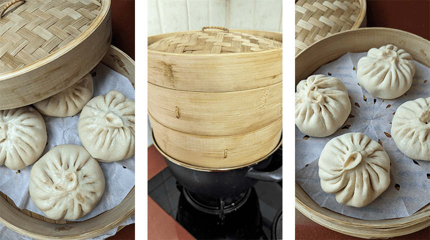 מאדים את הלחמניות – מרופדים סלסלת אידוי בנייר אפייה מחורר, מניחים בעדינות את הלחמניות בסיר האידוי עם רווחים ביניהן, סוגרים במכסה ומניחים מעל סיר עם מים רותחים. מאדים במשך 12 דק', מכבים את האש ומשאירים מכוסה 5 דק' נוספות. מוציאים מסיר האידוי ומגישים מיד.