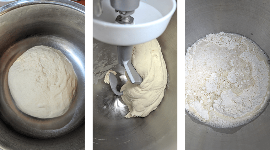 מנפים קמח לקערת מיקסר ומוסיפים את תערובת השמרים. לשים 5 דק' במהירות איטית, אם רואים שהבצק לא מתאחד מוסיפים בהדרגה 2-3 כפות מים, עד שכל הקמח נספג ונוצר בצק אחיד. מגבירים את מהירות המיקסר למהירות גבוהה ולשים 3 דקות נוספות. יוצרים מהבצק כדור, משמנים אותו ומניחים בקערה, מכסים ומתפיחים עד הכפלת הנפח כשעה, תלוי בטמפרטורת החדר.