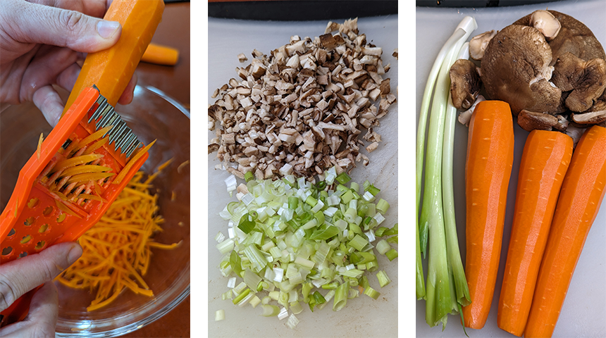 מכינים את המילוי – קוצצים בצל ירוק, מסירים את הרגליים מפטריות השיטאקי וקוצצים לקוביות קטנות. חותכים את הגזר לגפרורים דקים, אפשר בעזרת קולפן ייעודי.