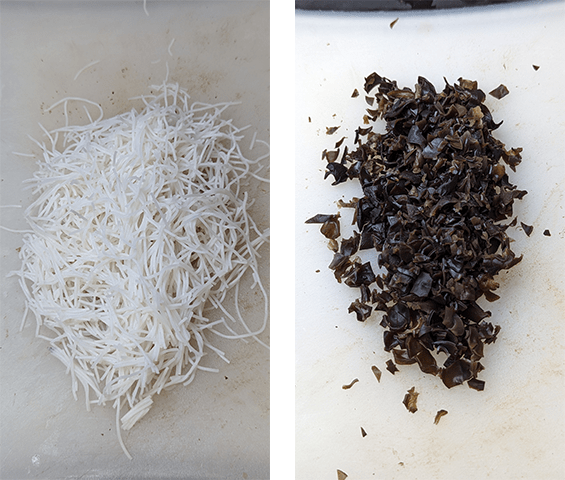 מסננים את הפטריות השחורות ממי ההשרייה, מסירים את החלקים הקשים וקוצצים דק. מסננים את אטריות האורז וחותכים למקטעים באורך של כ-5 ס"מ.