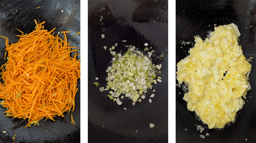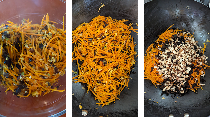 מחממים שמן בווק, מקשקשים ביצים ומוסיפים לווק, מטגנים למקושקשת בהירה ומוציאים לצלחת. מוסיפים מעט שמן לווק ומחממים, מוסיפים את הבצל הירוק ומטגנים מעט לריכוך קל. מוסיפים גזר, מטגנים דקה ומוסיפים את שני סוגי הפטריות, מטגנים יחד דקה נוספת ומסירים מהאש.