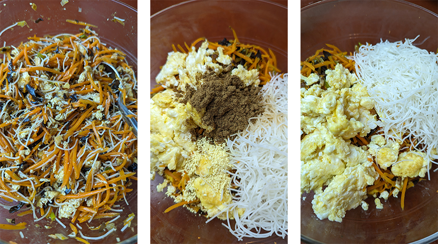 מעבירים את הירקות המטוגנים לקערה, מוסיפים אטריות אורז וביצים, מתבלים ברוטב סויה, אבקת מרק ותערובת חמשת התבלינים. מוסיפים שמן שומשום ומערבבים. טועמים ומתקנים תיבול לפי הטעם.