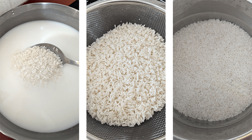מבשלים את האורז – מסננים את האורז ממי ההשרייה. במחבת רחבה ועמוקה שמים חלב קוקוס, מים, מלח ואת האורז. מניחים על אש גבוהה ומביאים לרתיחה. מנמיכים את האש ומבשלים כ-5 דקות עד שהאורז מתנפח וסופג את רוב הנוזלים, מערבבים מידי פעם.