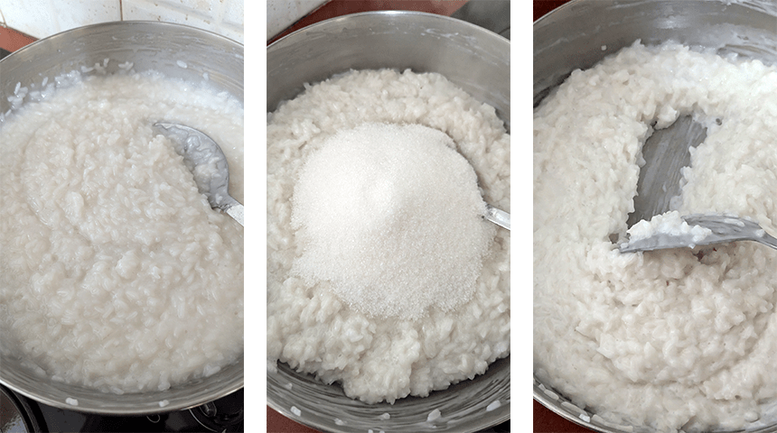 מוסיפים סוכר, מעבירים לאש נמוכה וממשיכים לבשל כ-25 דקות תוך ערבוב מתמיד עד שתערובת האורז נפרדת בקלות משולי המחבת והאורז רך.