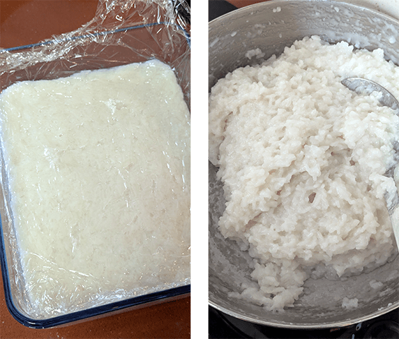 שוטפים את האורז הדביק – מניחים את האורז בקערה, ממלאים במים ומערבבים עד שהמים הופכים לבנים, שופכים את המים וחוזרים על הפעולה פעם נוספת. משרים את האורז בהרבה מים למשך הלילה.