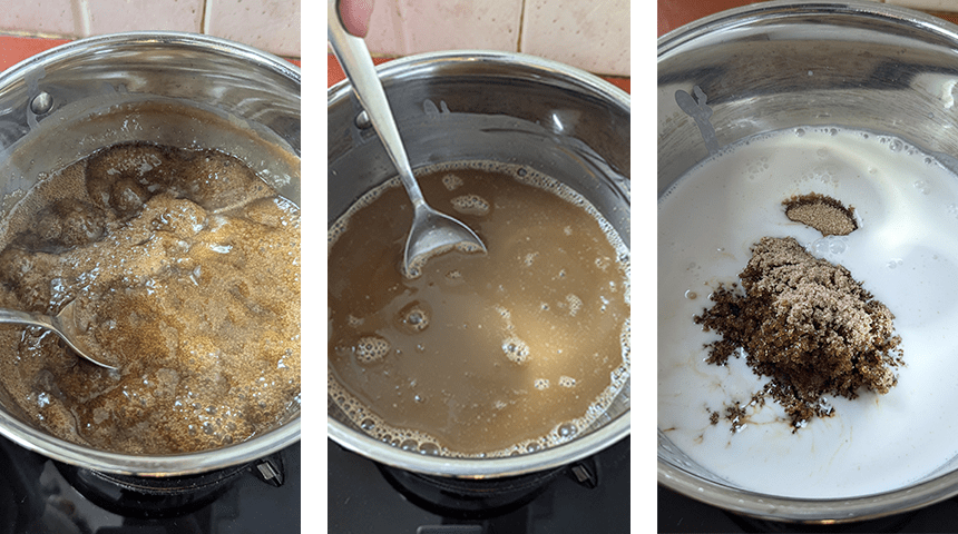 מכינים קרמל קוקוס – שמים קרם קוקוס ושני סוגי סוכר בקלחת. מניחים על אש בינונית-נמוכה, מביאים לרתיחה ומבשלים כ-15 דקות עד שחלב הקוקוס מסמיך.