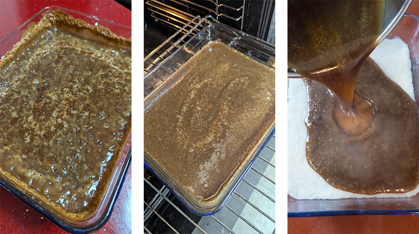 מכניסים את התבנית לתנור החם ואופים 35-40 דקות עד שציפוי הקרמל שחום ומבעבע. מוציאים את התבנית מהתנור ומניחים לצינון מלא.
