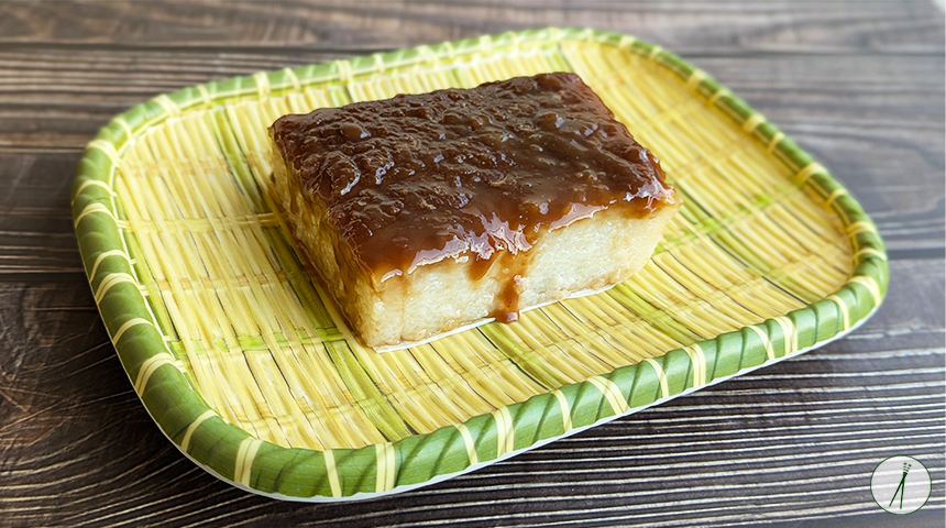 מסירים את הניילון מעל האורז שבתבנית, שופכים את קרמל הקוקוס על האורז ומשטחים בצורה אחידה על פני האורז.