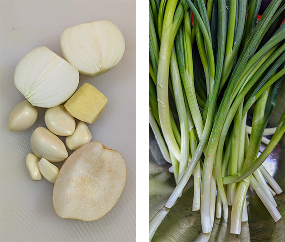 מקלפים ג'ינג'ר, בצל, שום ונאשי. מכניסים למעבד מזון יחד עם חצי כוס מים ומעבדים לתערובת דקה ואחידה. מעבירים את התערובת לקערה ומוסיפים ג'וצ'וגארו, רוטב דגים ואת הרביכה שהכנו קודם ומערבבים היטב.