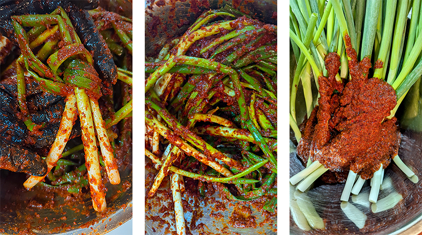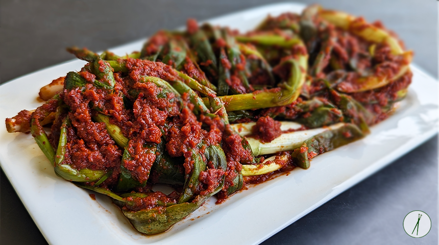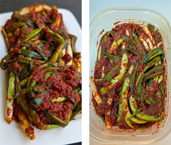 פה קימצ'י – Pa-kimchi. קימצ'י בצל ירוק קוריאני הנאכל כתוספת לצד הארוחה (באנצ'אן). מכיוון שהוא דורש זמן תסיסה קצר יחסית, קימצ'י הבצל הירוק מתאים לאכילה גם זמן קצר לאחר ההכנה והוא מושלם לתקופה בה הכרוב הסיני לא בעונה.