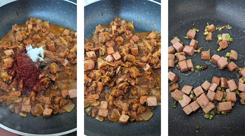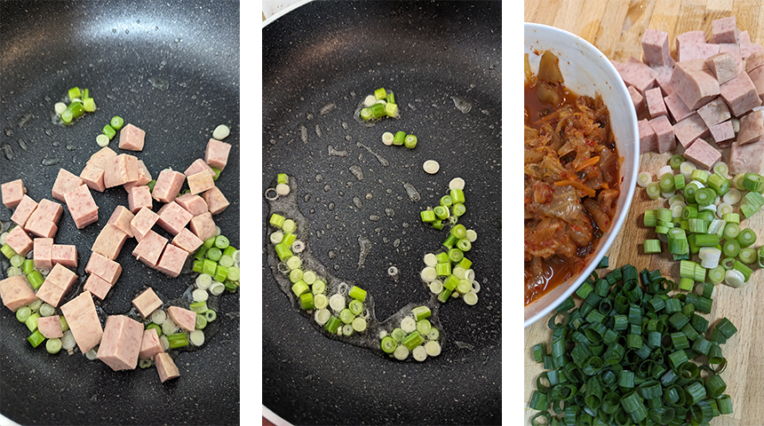 מכינים את המרכיבים – מחלקים את הבצל הירוק לחלקים ירוקים וחלקים לבנים ופורסים דק. חותכים את הספאם לקוביות בגודל 1×1 ס"מ וקוצצים את הקימצ'י לקוביות קטנות, רצוי בעזרת מספריים.